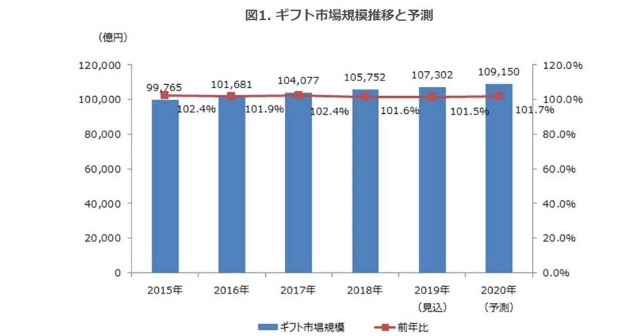 19年のギフト市場規模は前年比101 5 の10兆7 302億円 プラス成長が続く 矢野経済研究所調べ 売れるネットショップの教科書 Note